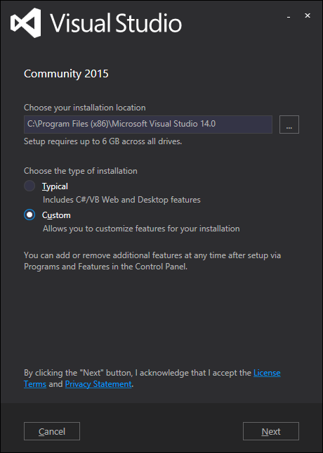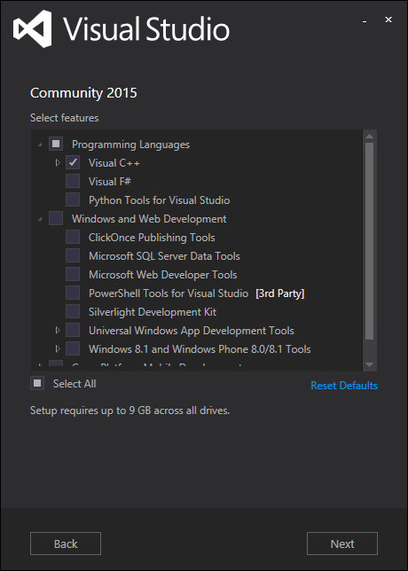 确保在安装时选择了Visual C++的功能。首先选择Custom installlation